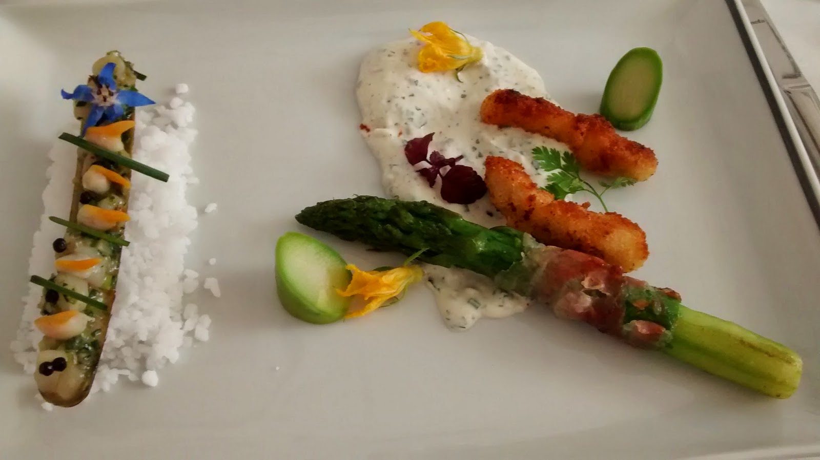 - Starter: razor clam as tartare and deep fried accompanied by aspargus wrapped in bacon and Greek yogurt dressing